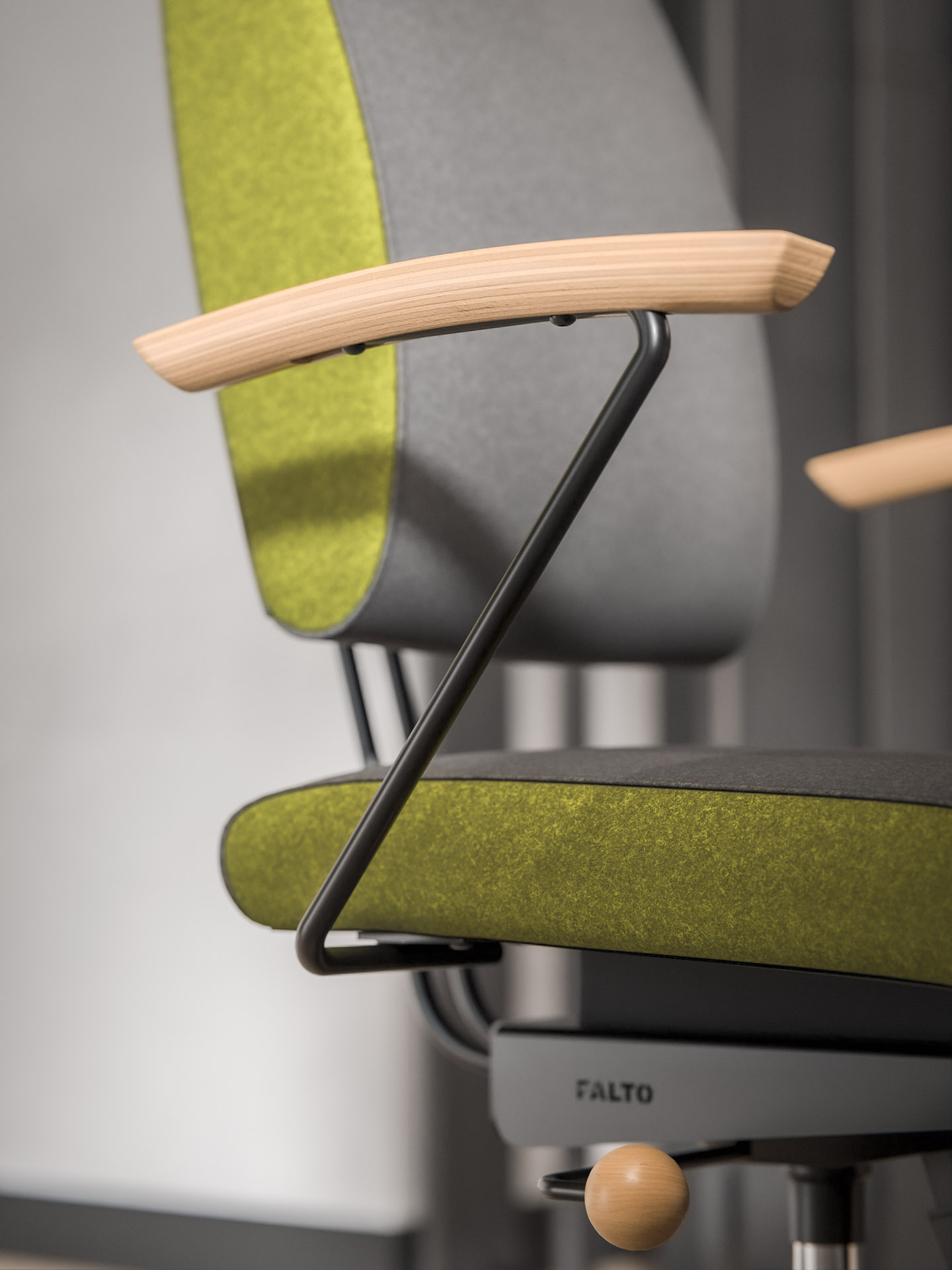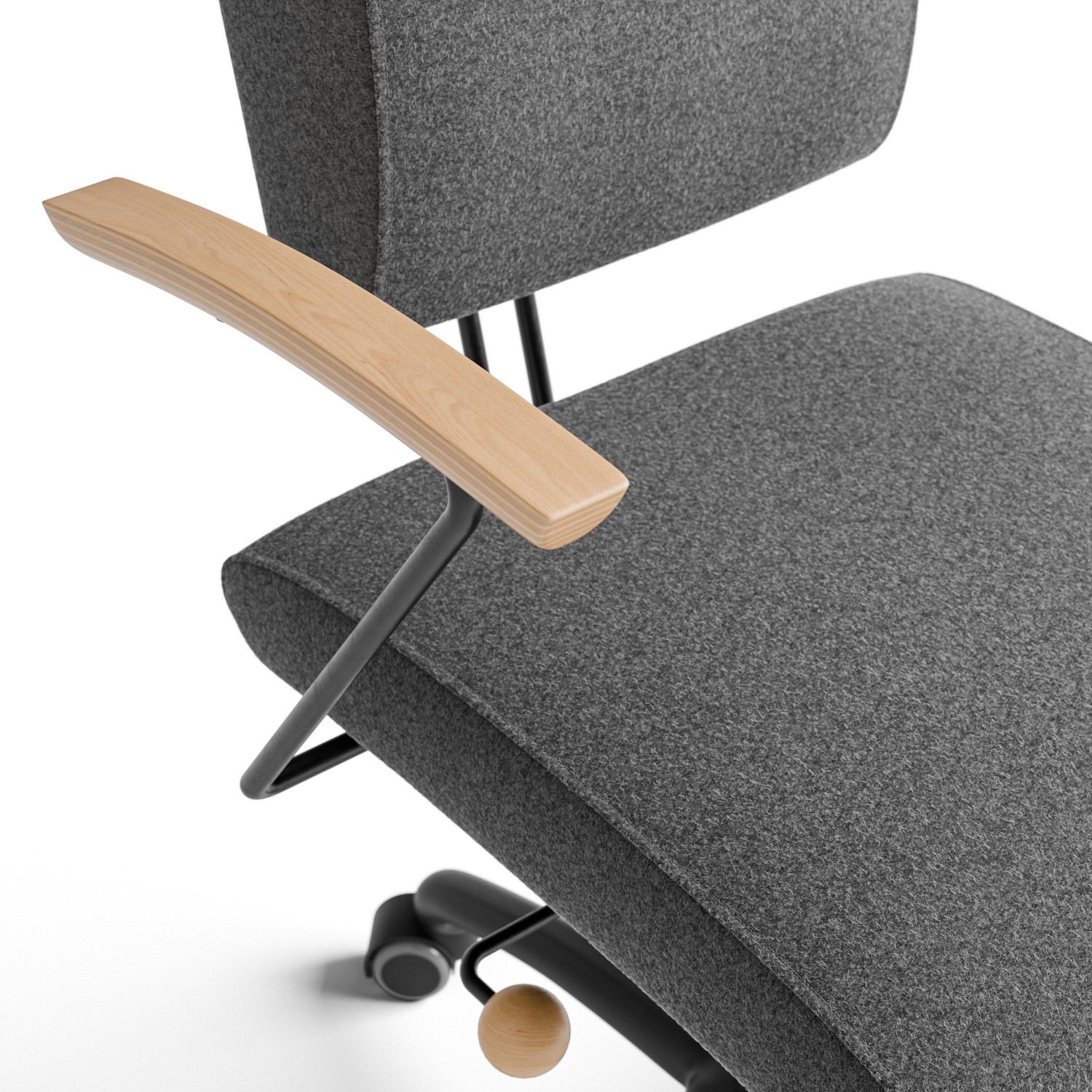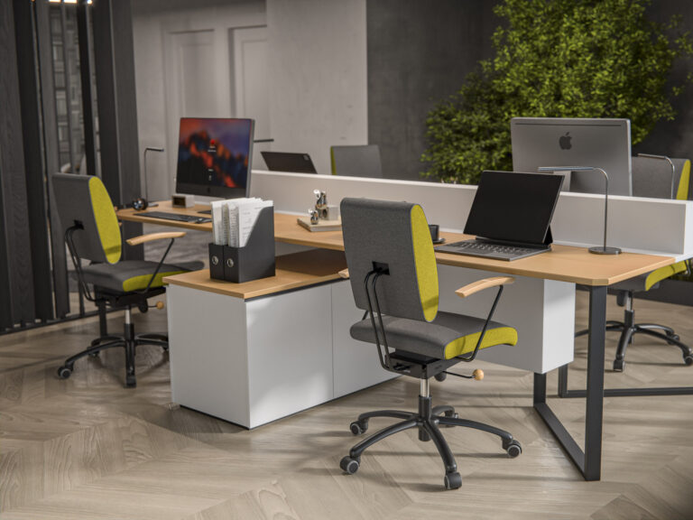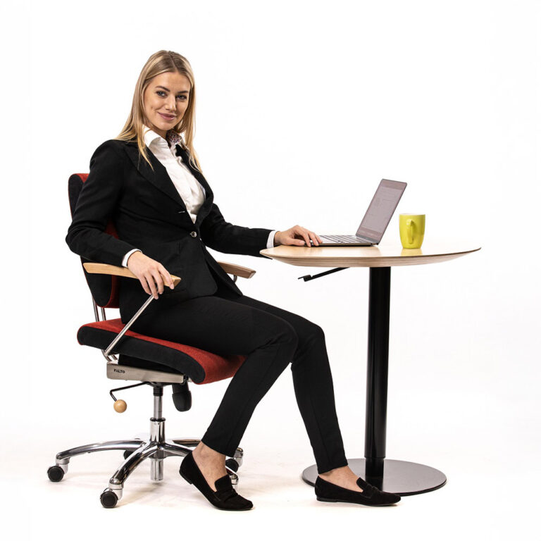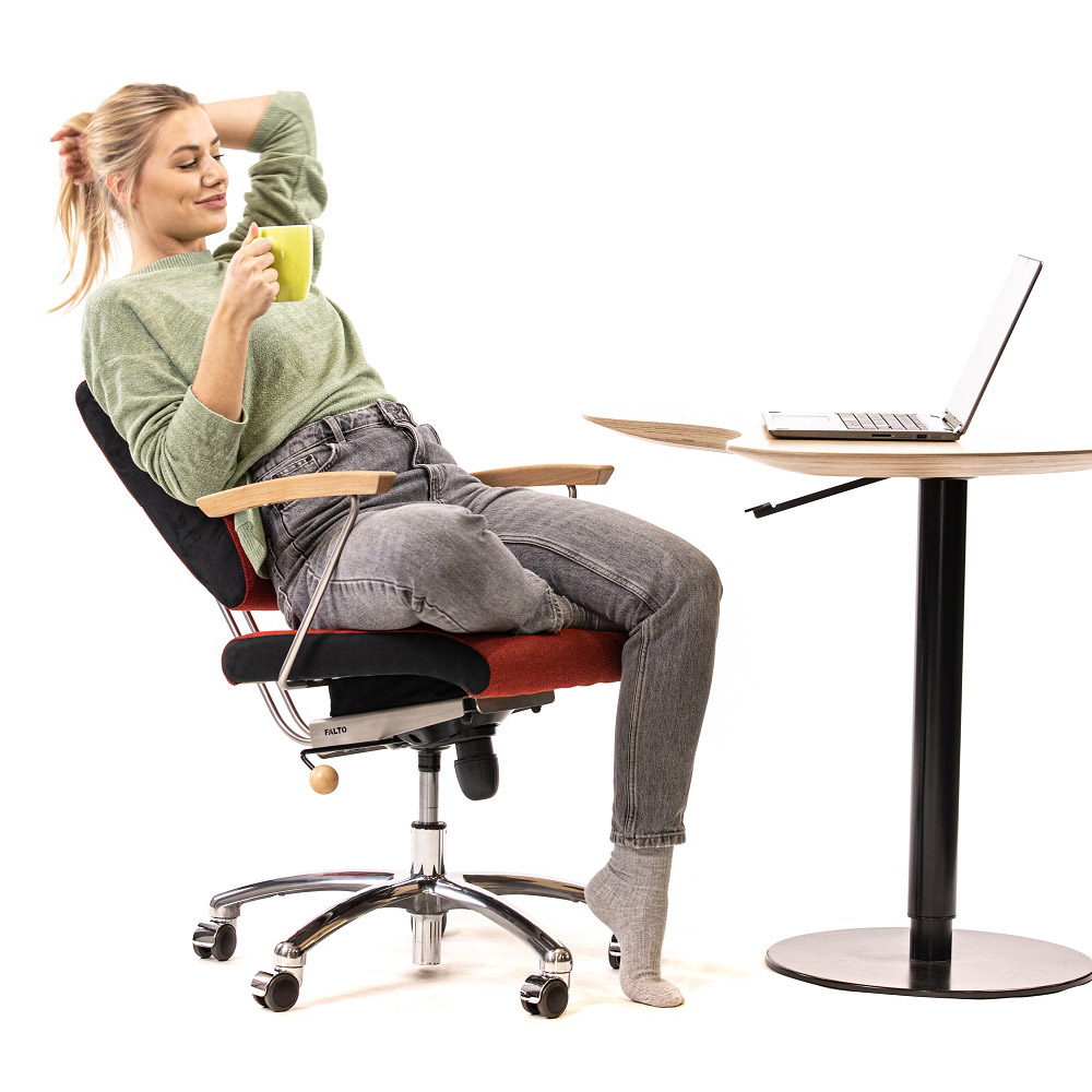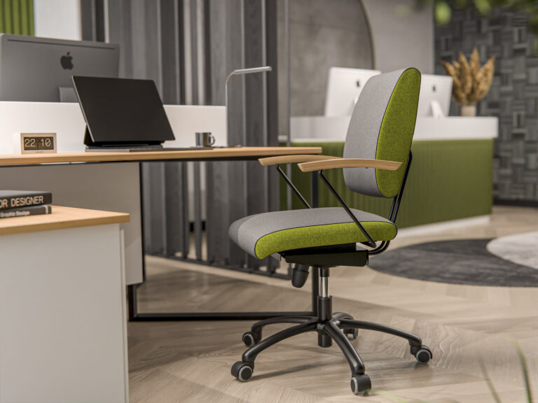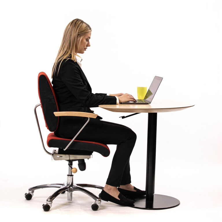 Krzesło harmonijnej symbiozy: trójdymensionalnie ruchome siedzisko, ruchome oparcie dopasowujące się do pleców przy tym obrotowe i z regulacją wysokości, a jeśli zaistnieje taka potrzeba również na kółkach.